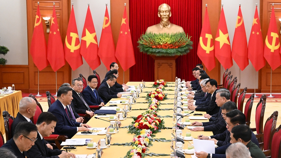 و سی پی سی سینٹرل کمیٹی کے جنرل سیکریٹری اور چینی صدر شی جن پھںگ نے ویتنام کی کمیونسٹ پارٹی کے ہیڈگواٹرز میں کمیونسٹ پارٹی آف ویتنام کی مرکزی کمیٹی کے جنرل سیکریٹری تولام کے ساتھ بات چیت کی۔