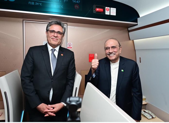 میانیانگ۔14ستمبر:صدر مملکت آصف علی زرداری نےچین کے شہر چینگڈو سے میانیانگ تک ہائی اسپیڈ ٹرین کے ذریعے سفر کیا، جو تقریباً آدھے گھنٹے میں مکمل ہوا۔سفر کے دوران صدر مملکت کو ٹرین کے نظام، سروسز، حفاظتی اقدامات اور ماحولیاتی فوائد کے بارے میں بریفنگ دی گئی۔ایوان صدر کے میڈیا ونگ سے جاری بیان کے مطابق حکام نے بتایا کہ چین کے پاس دنیا کا سب سے بڑا ہائی سپیڈ ریلوے نیٹ ورک ہے جو 45 ہزار کلومیٹر سے زائد پٹریوں پر مشتمل ہے اور سالانہ دو ارب سے زیادہ مسافروں کو سہولت فراہم کرتا ہے۔ یہ ٹرینیں 350 کلومیٹر فی گھنٹہ کی رفتار سے چلتی ہیں اور تقریباً تمام بڑے چینی شہروں کو آپس میں جوڑتی ہیں۔