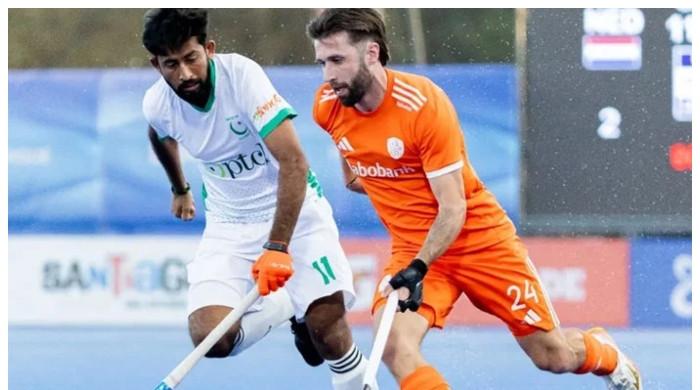 تفصیلات کے مطابق سان ٹائیگو ہاکی اسٹیڈیم میں پاکستان اور نیدرلینڈز کا آمنا سامنا ہوا۔ پہلےہاف میں پاکستان نے نویں منٹ میں حنان شاہد کے گول کے ذریعے سبقت حاصل کی لیکن تین منٹ بعد نیدرلینڈز نے نہ صرف مقابلہ برابر کردیا بلکہ پندرویں منٹ میں مقابلہ دو ایک کردیا۔